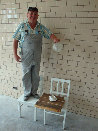 Rudi ist zurück aus den Bergen. Begrüsst heute morgen die Kreativ-Abteilung mit der Frage, ob wir im Erdgeschoss ein Schlachthaus einrichten wollen. Der Fliesenleger mischt sich ein mit der Assoziation ‘Gemeinschaftsdusche’. Wir denken zufrieden an ein Kaffeehaus um die Jahrhundertwende und freuen uns über die ersten Kacheln an der Wand und eine Zielgruppe 60 -.