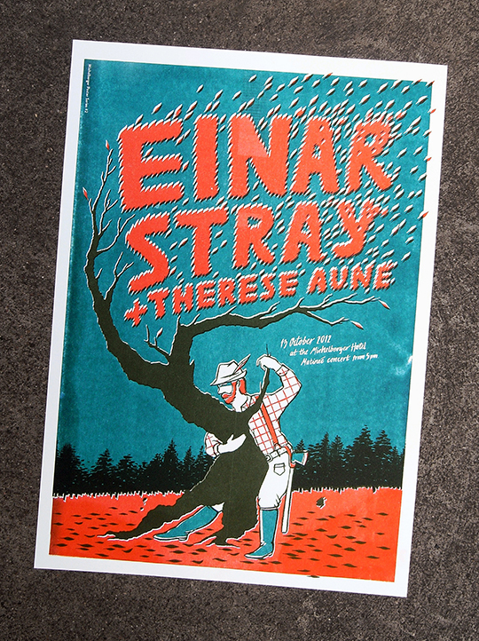 What’s Happened 11/10/2012 Michelberger Poster Series #2 Here’s the second poster in our series. This time it’s an A3 Risograph, printed in 3 colours on 250gm Munken white. It’s for the Einar Stray and Therese Aune concert coming up this Saturday in the lobby.
