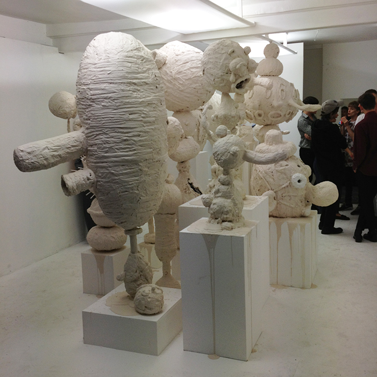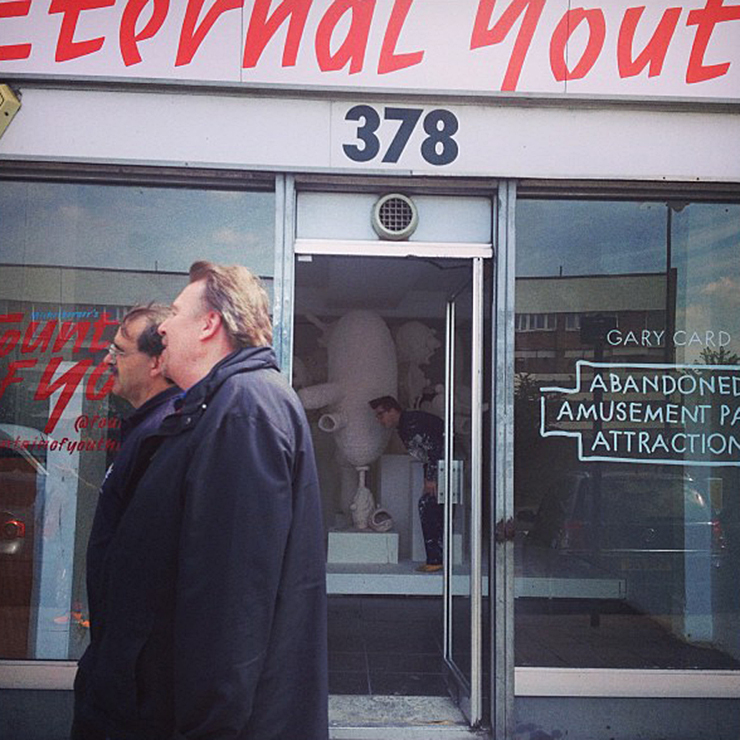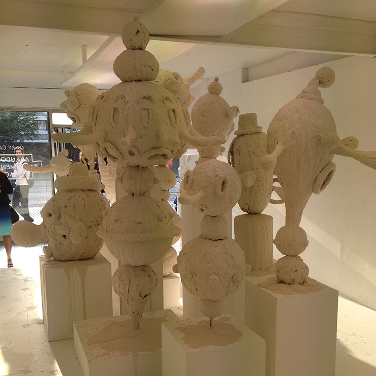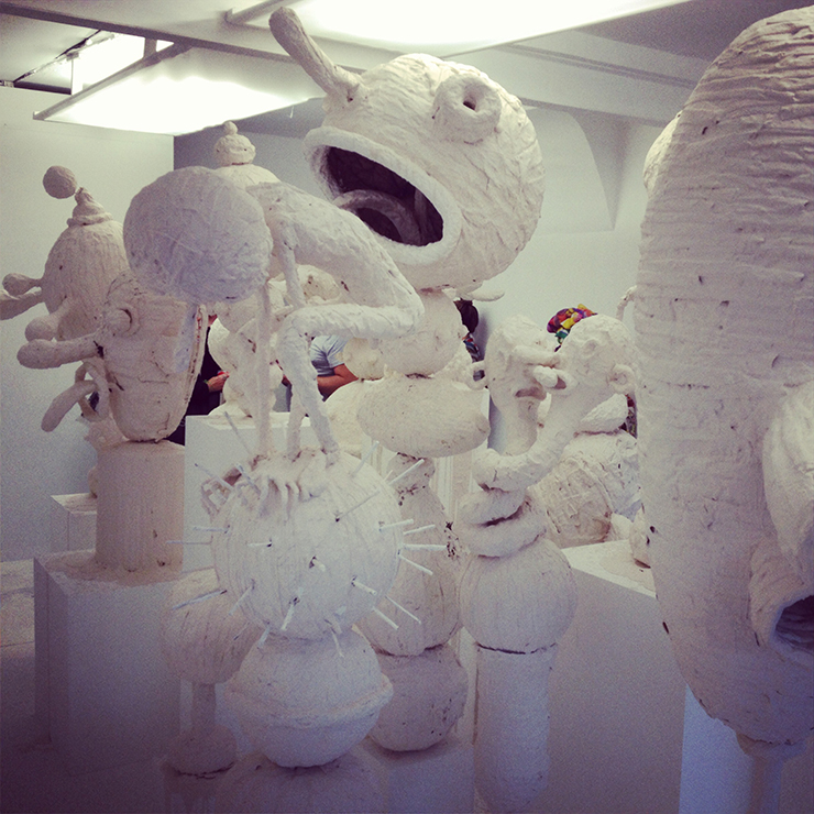 At our Fountain of Youth pop up shop in London, an exhibition by Gary Card, his first solo one, has just opened. It’s called Abandoned Amusement Park Attraction and it’s populated with strange big-nosed, open-mouthed, goggle-eyed characters sculpted from wire and 300 rolls of masking tape.
