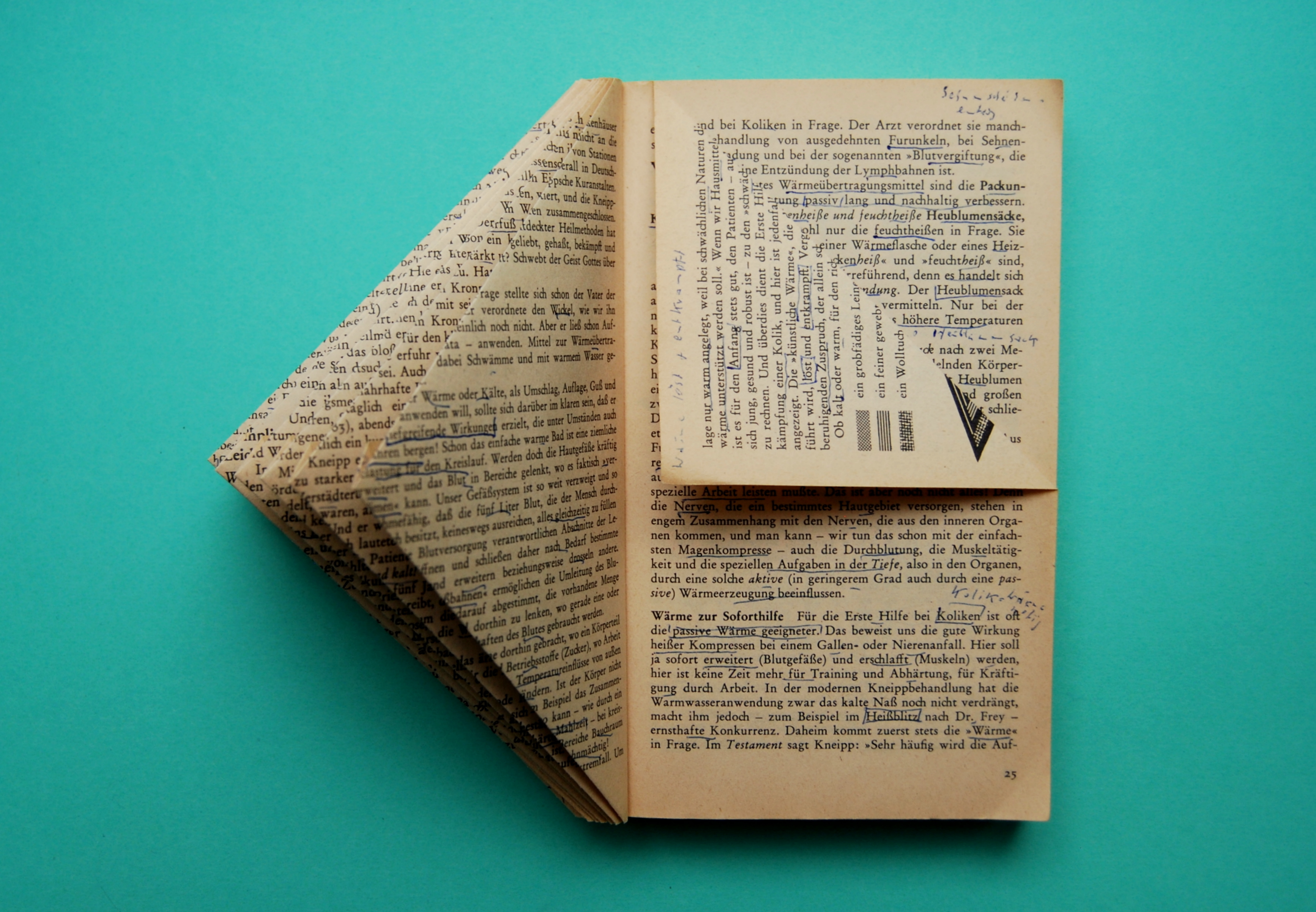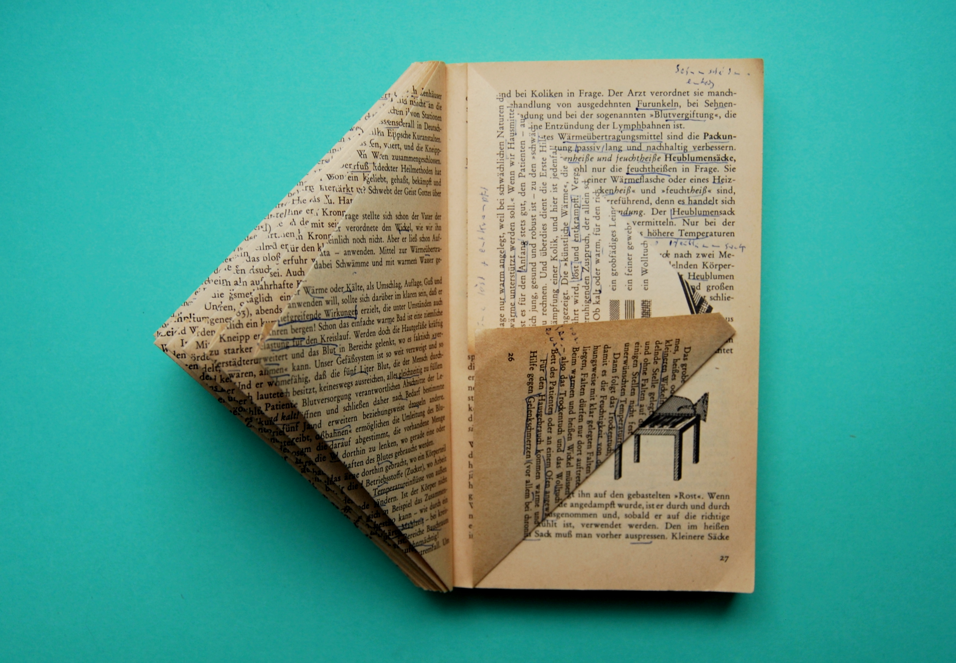 Step 1: Entferne das Cover des Buches. Suche Dir eine Linie nach der Du dich beim Falten orientierst (wie z.B. der Zeilenanfang) und falte den oberen Teil der Seite zu einem rechtwinkligen Dreieck (s. Bild).