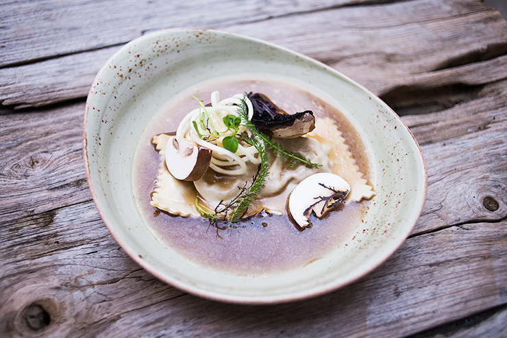 One of the many stars is the Maultaschen soup starter, Autumn on a plate. These handmade German-style ravioli are filled with a mixture of fresh, seasonal mushrooms from Brandenburg, as well as onions, juniper berries, marjoram, parsley and pepper. With the plate there’s a light, aromatic stock to be poured over it, made from soaking dried mushrooms with comforting herbs such as thyme, spices and ground porcini to add even more umami. The dish is garnished with celery and raw forest maronen & portobello mushrooms. Another Autumnal starter is the spiced pear salad with radicchio, truffle and gingerbread that snaps like dried leaves underfoot.