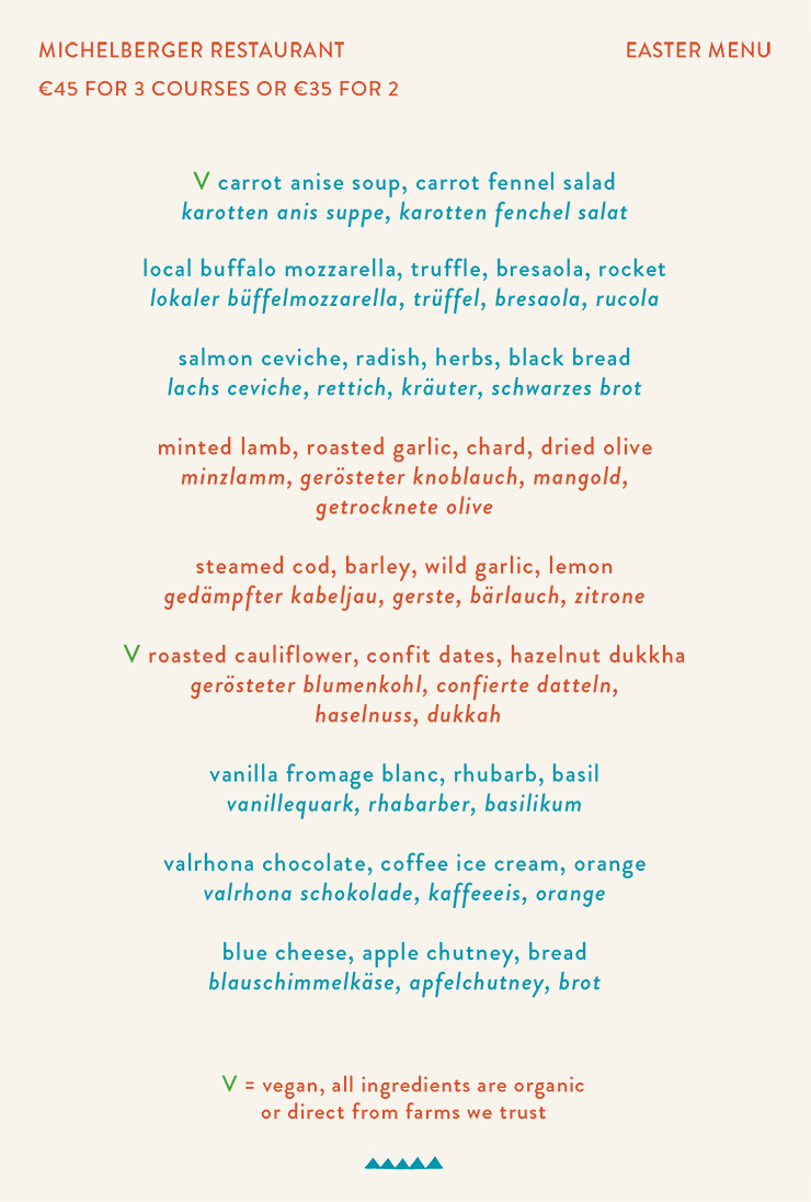 On Easter Sunday & Monday, we’ll be serving breakfast a little longer than normal, until 2 pm. There’ll be a special Easter menu for dinner on both those nights, which will cost €45 for three courses or €35 for two.
