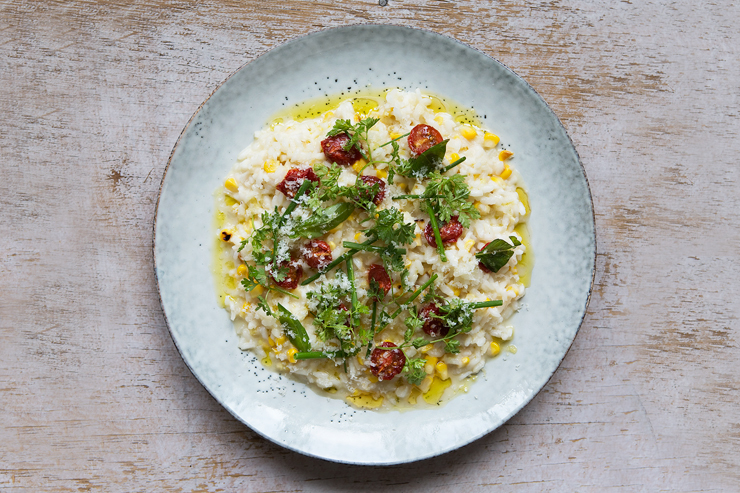 Sweetcorn risotto, smoked cherry tomatoes, summer herbs.