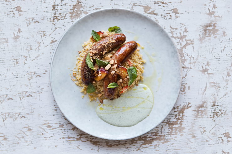 Spicy beef Merguez sausages, roast pepper, couscous, plum, almond
