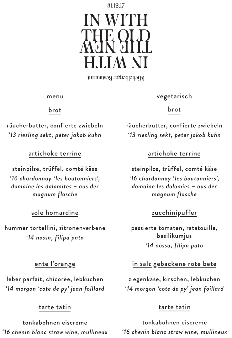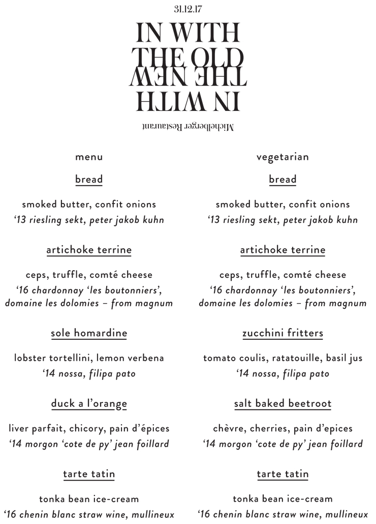 The menu package is 150€ per person all inclusive or 120€ for the vegetarian option. Any other dietary requirements can be discussed with our reservation team. We’ll have a DJ in the restaurant and over in our bar too. Bookings are being taken from 18:30 – please email reservations@michelbergerhotel.com or call 030 297 78590